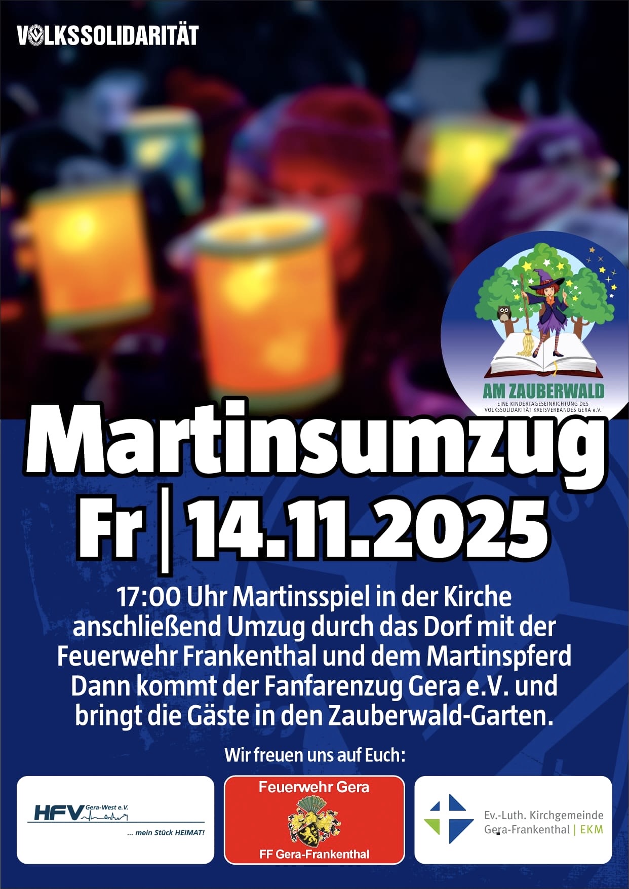 Martinsfest mit Laternenumzug Wann 14. November 2025 17:00 Zum Kalender hinzufügen ICS herunterladen Google Kalender iCalendar Office 365 Outlook Live Wo Allerheiligenkirche Frankenthal Am Gerberg, 07548 Gera - Frankenthal Veranstaltungstyp Gottesdienst Kirchliche Veranstaltungen in Frankenthal Martinsfest Regionale Veranstaltungen in den Westvororten Freiwillige Feuerwehr Gera-Frankenthal, Heimat- und Feuerwehrverein Gera West e.V., Kindergarten "Am Zauberwald", Martinsfest, Pfarrer Dr. Hiddemann